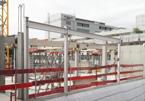 Premier plancher de la surélévation en dalles alvéolaires, prêt pour coulage. « Desaix » est un projet de rénovation et de surélévation d’un immeuble tertiaire dans le 15e arrondissement de Paris, destiné à…